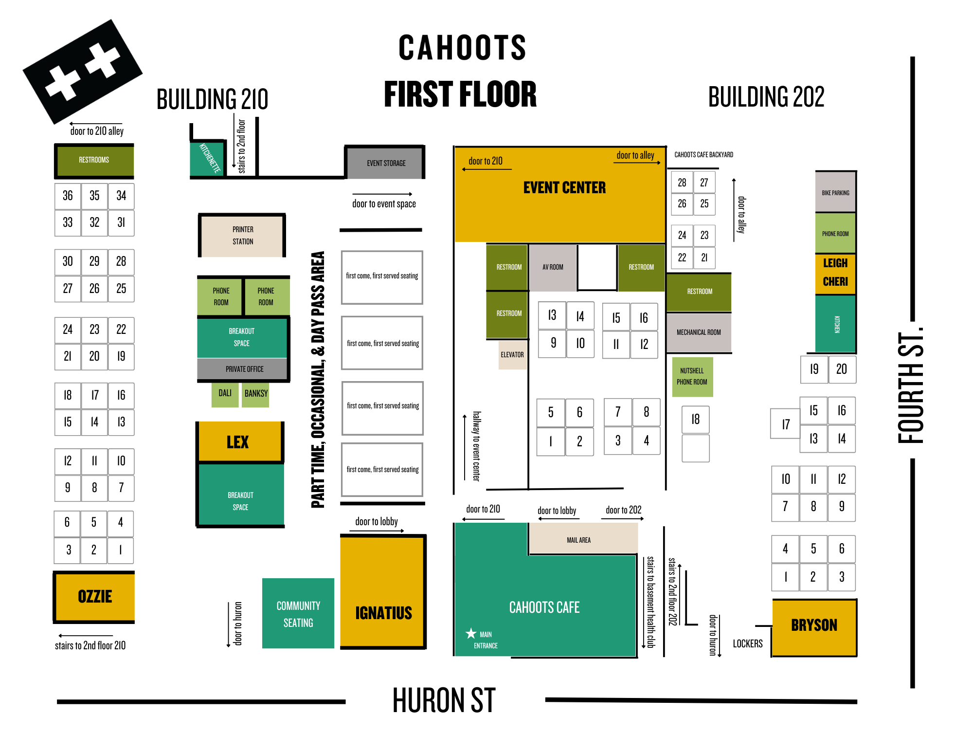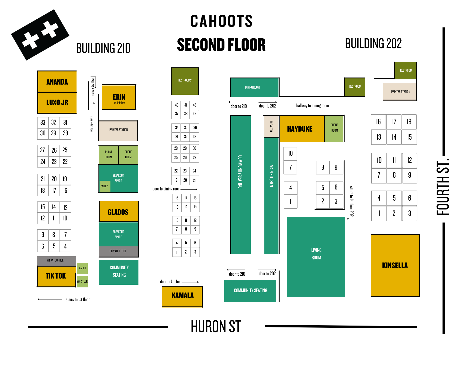 Cahoots is made up of three historic buildings renovated together and representing 24,000sqft. The office building closest to Fourth St is called 202, and building furthest from Fourth St is 210. The building in the middle serves as the connector and place for people to meet in the middle, through the cafe and event space on the first floor, and the main kitchen on the second floor. You can download and reference our map at any time to orient yourself to the space and find the room you are looking for.
